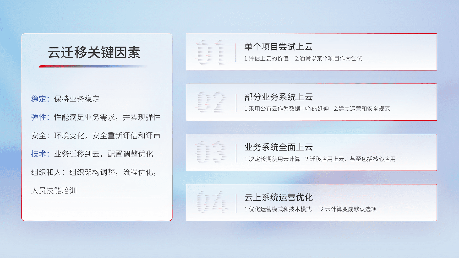 结合实际业务,,从规划设计、、云平台选型、、、、云原生改造、、、数据迁移、、、集成交付,,迁移全过程为客户识别最佳上云路径,,,做好风险识别管理,,,,设计网络架构、、、、身份权限、、安全审计合规、、、操作审计、、、日志审计、、、、监控告警策略、、、、多站点容灾设计等,,对云上基础设施进行整体规划,,提升IT治理水平,,,以满足弹性、、、、高可用、、、、高性能的需求。。。