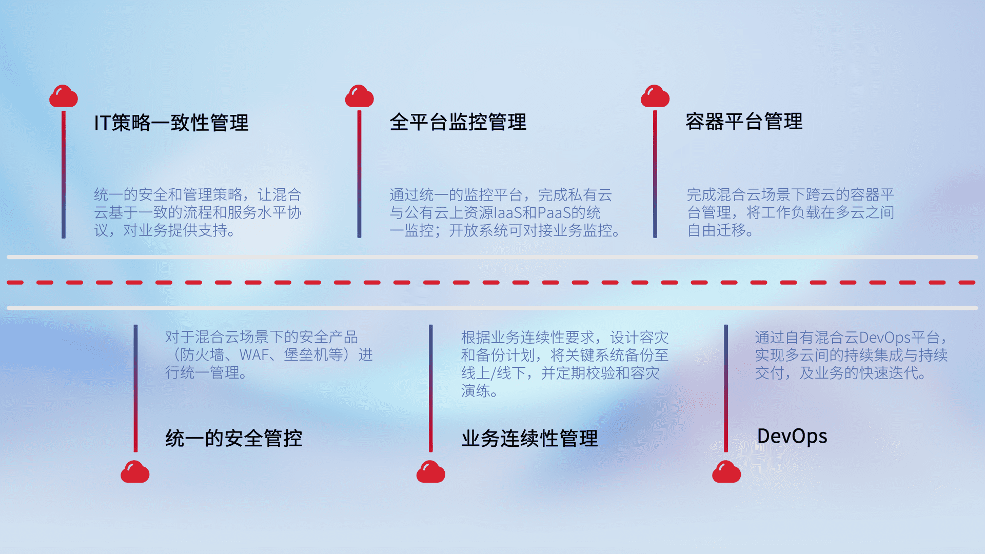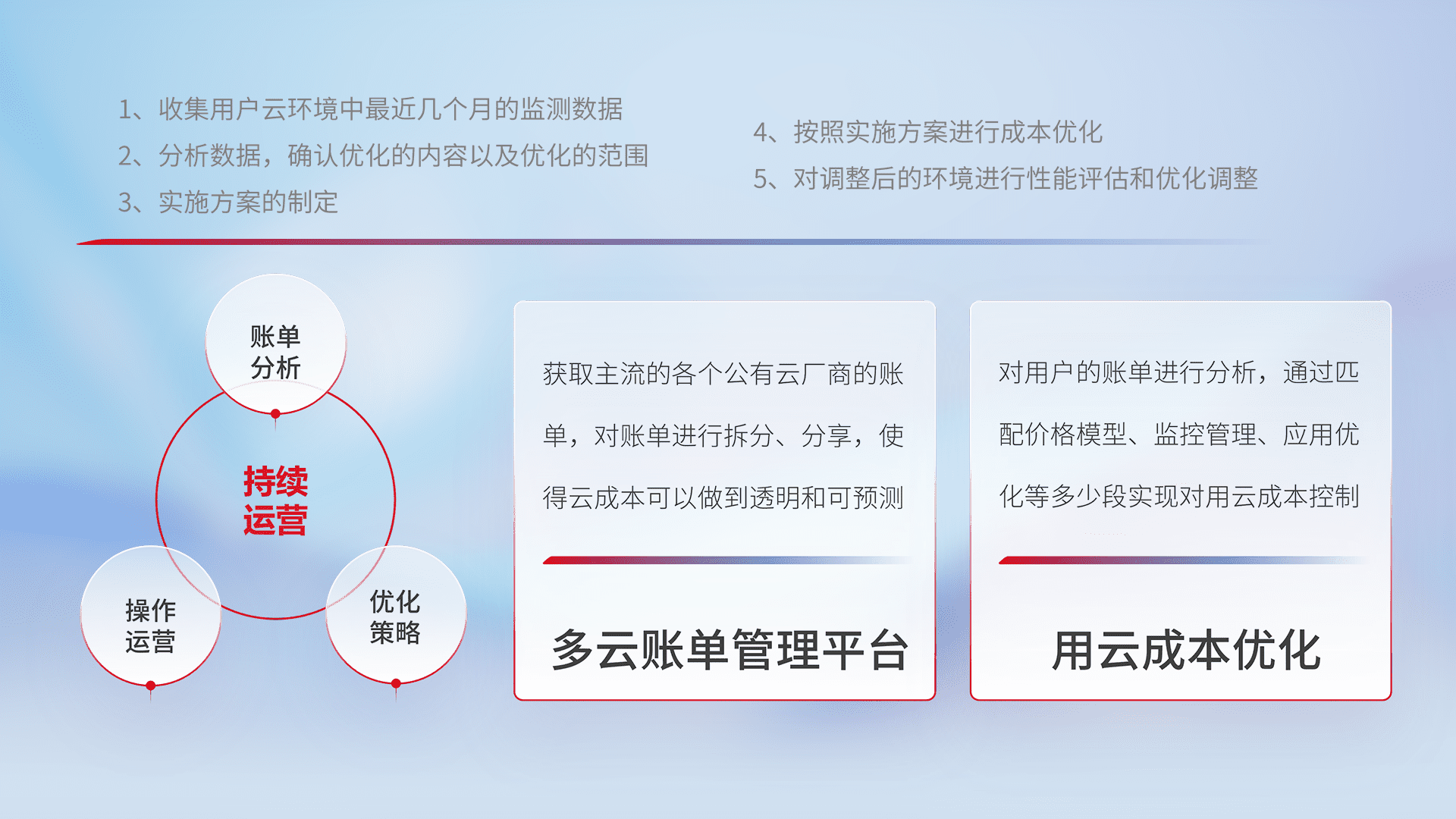通过多云纳管,,以统一的资源数据模型把客户的云资源进行抽象和封装,,,,进而实现对多云资源的统一操作,,保障云资源管理的可靠性、、稳定性与可用性。。。量身定制化运维内容,,,配置、、、开发运维、、补丁管理、、、、备份、、、监控、、认证和访问管理、、、、审计和日常巡检等,,,保障在用云过程中的可靠度,,稳定度以及高可用率。。。