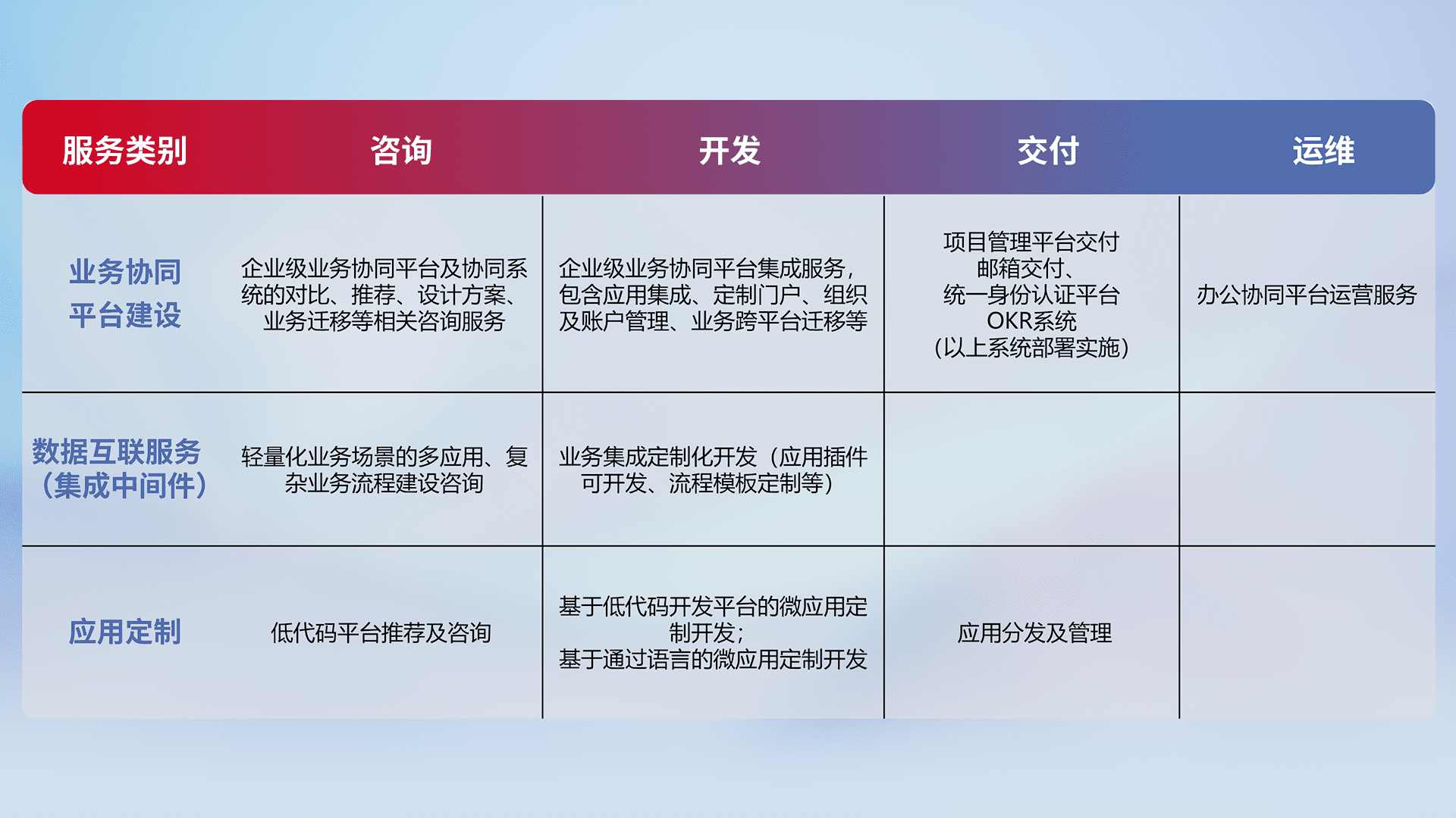 针对钉钉、、、、企微、、IDaas等平台级产品提供产品的规划、、、方案、、、、交付、、定制化开发等服务,,,,实现如统一协同办公、、智能客户服务、、、、混合会议管理、、智能数据查询、、、等业务场景,,,,实现数字化转型。。。