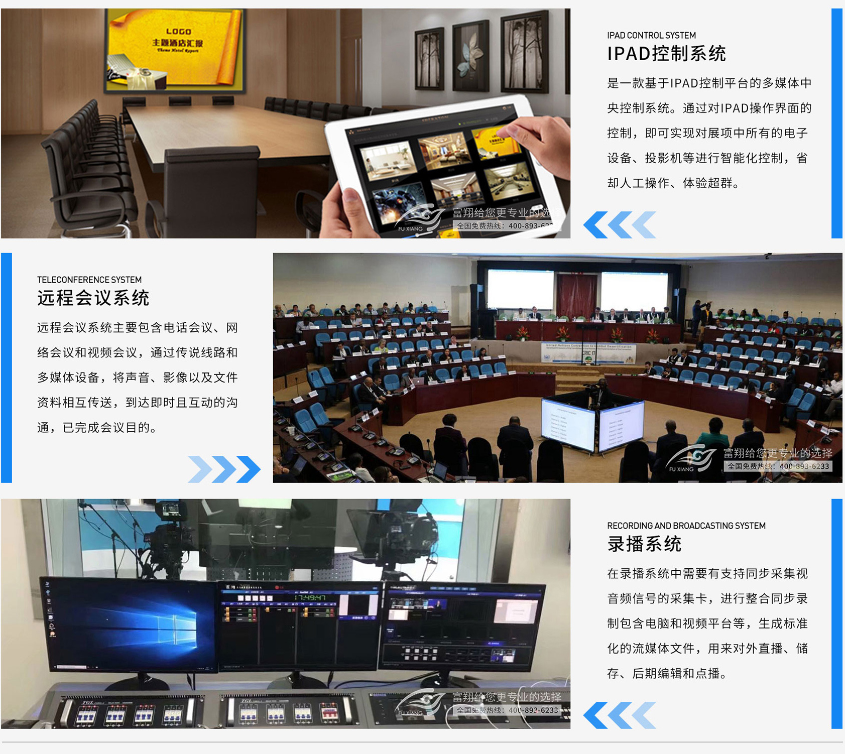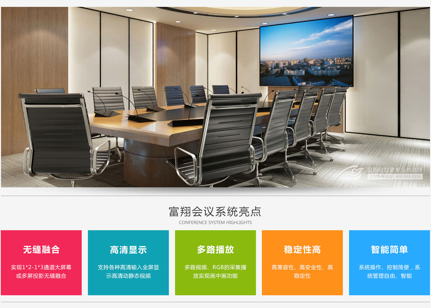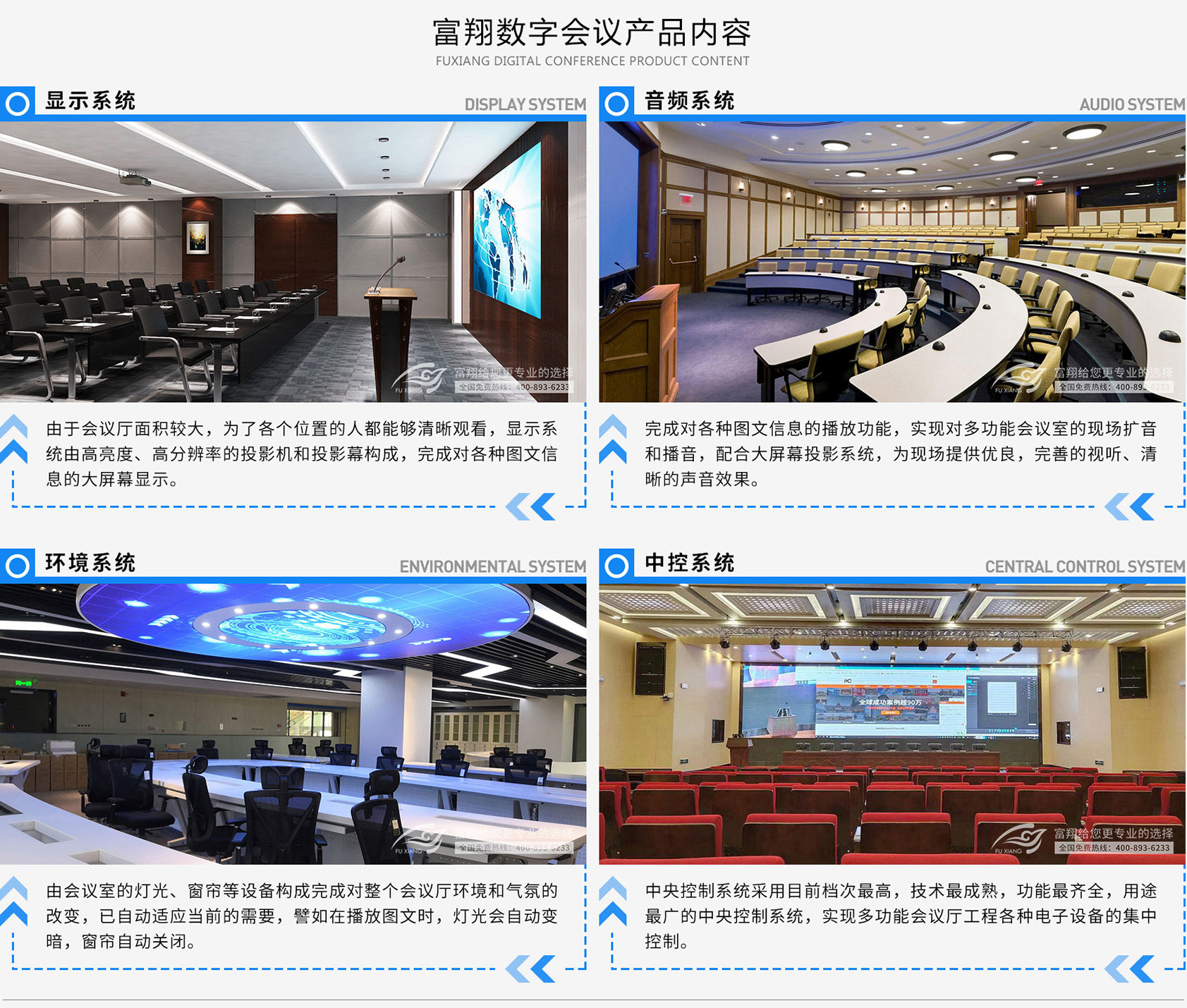 多功能会议室是满足召开各种报告会、、演讲会、、、学术交流会等需要的平台。。实现组织收看各种影片资料等;实现视频高清晰显示和音频的环绕声播放;实现整个会场内大屏、、、信号切换、、电源控制等系统的统一管理与控制。。